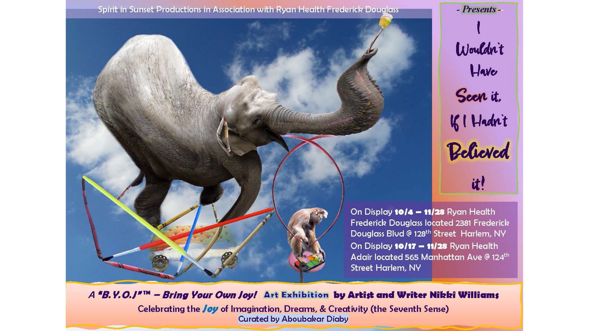 Bring Your Own Joy! Solo Art Exhibit Celebrating the Joy of Imagination, Creativity, and Dreamed Vision by Harlem Artist and Writer Nikki Williams. The exhibit will be on view from October 4, 2022, through November 28, 2022, in all four windows of Ryan Health Frederick Douglass located at 2381 Frederick Douglass Blvd and 128th Street. An Artist Talk will take place on Monday, October 24, 2022, from 3:00 – 5:00 p.m. The Artist Talk will be a “Wondrous Walk Observing the Everyday Creativity of Harlem and its Citizens” starting from Ryan Health Frederick Douglass and concluding at Ryan Health Adair located at 565 Manhattan Avenue at 124th Street in Harlem.